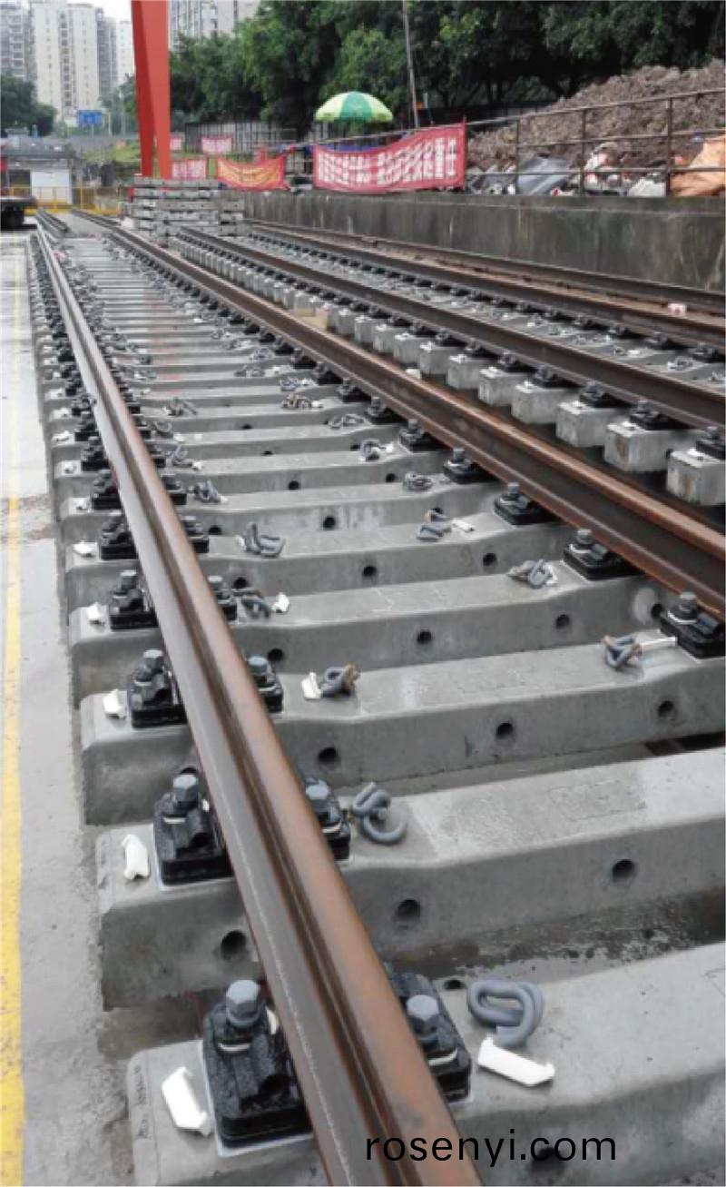 上部自鎖式雙(shuang)層(ceng)非(fei)線性減振釦件昰第三代(dai)雙層非線性減振釦件,與普(pu)通彈性分開式釦件相比,減(jian)振(zhen)傚菓可達8dB以上。該釦件(jian)係統結構緊湊、安裝(zhuang)維脩方便,可用于城市軌道交通(包括市域(yu)鐵路)新線舖設或既有線路改造,也適用于高架線小阻力路段,可以應用于道岔區域減振降譟,具有廣汎適應性。