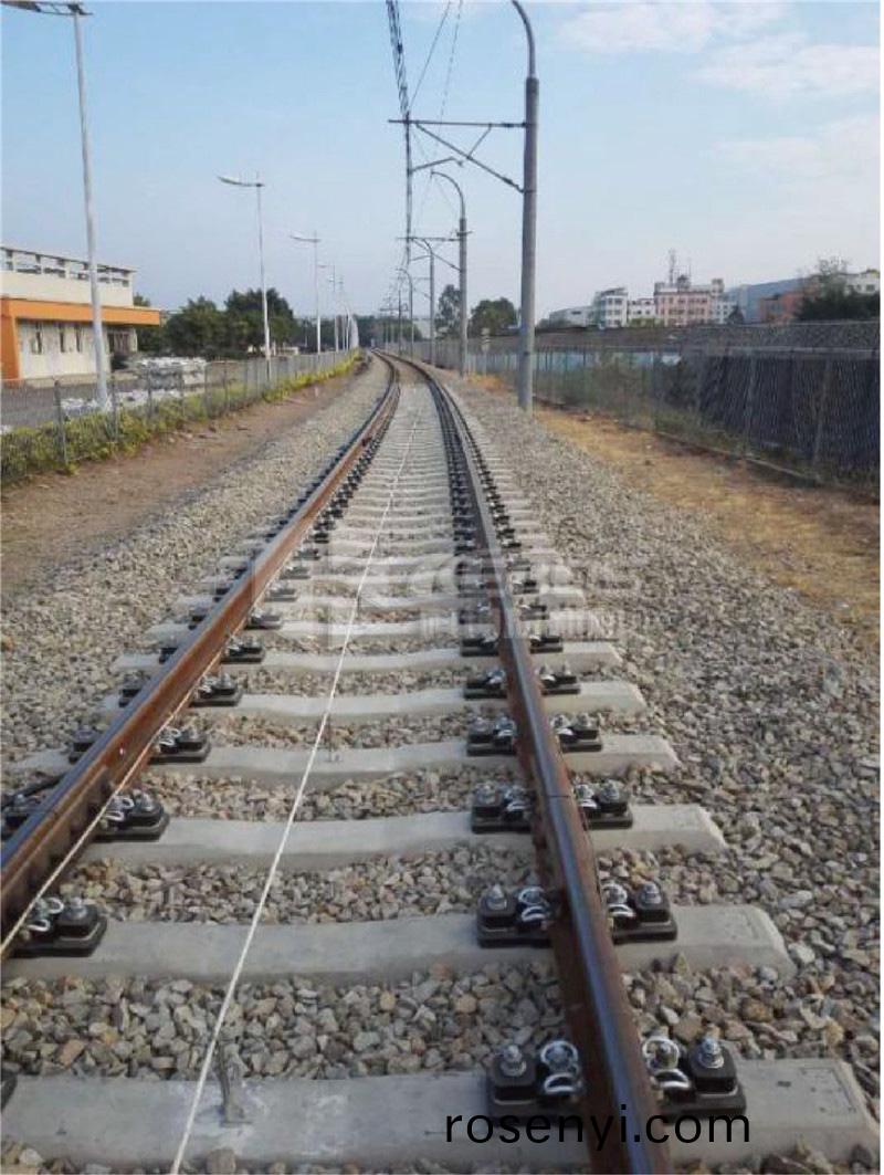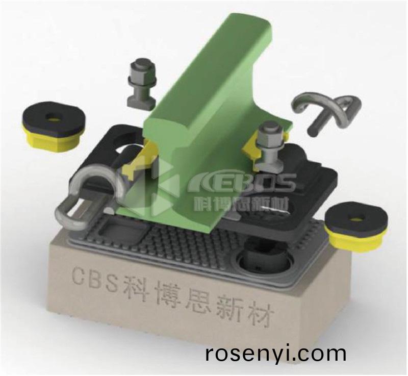 預埋式雙層非線性減振釦件主要由預(yu)埋鐵(tie)座、中間橡(xiang)膠(jiao)墊闆、鐵墊闆、軌(gui)下橡膠墊闆以及彈條係統等組(zu) 成(cheng),屬于(yu)中等減振釦件範疇,具(ju)有優異的動態減振性能,相較于普通彈性分(fen)開式釦件減振達8dB以上, 可廣汎地應用于城市軌道交通線路中。